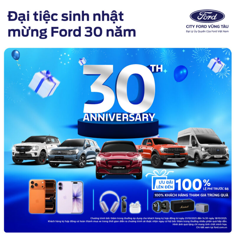 Tháng 10/2025 đánh dấu cột mốc đặc biệt – 30 năm Ford đồng hành cùng khách hàng Việt Nam. Nhân dịp này, Ford Việt Nam và hệ thống Đại lý trên toàn quốc chính thức triển khai chương trình khuyến mãi hấp dẫn mang tên “Đại Tiệc Sinh Nhật Mừng Ford 30 Năm”, diễn ra từ 01/10 đến 18/10/2025, với tổng giá trị giải thưởng lên tới gần 6 tỷ đồng.